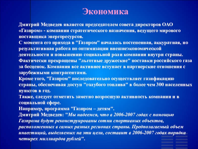 Дмитрий Медведев является председателем совета директоров ОАО «Газпром» - компании стратегического назначения,