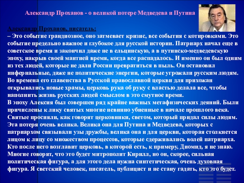 Слайд 15Александр Проханов - о великой потере Медведева и Путина