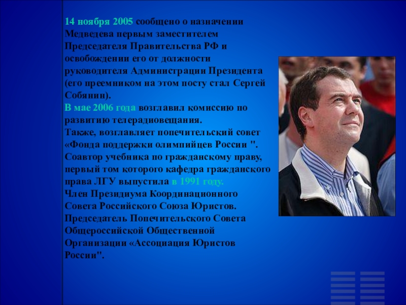 Слайд 614 ноября 2005 сообщено о назначении Медведева первым заместителем Председателя Правительства РФ