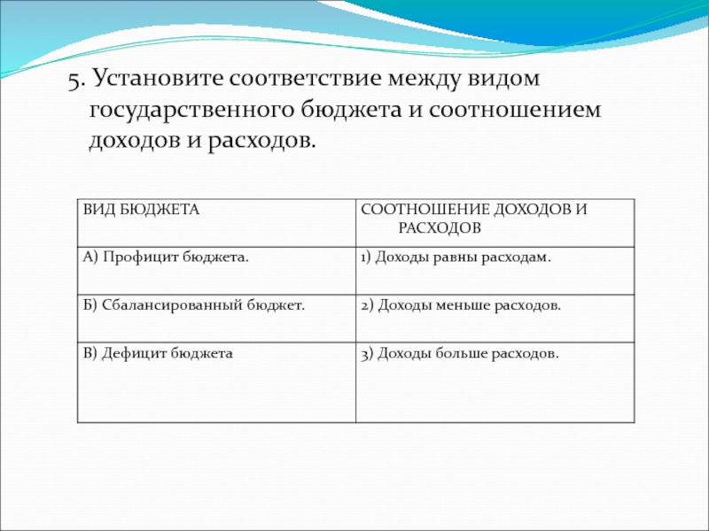 5. Установите соответствие между видом государственного бюджета и соотношением доходов и