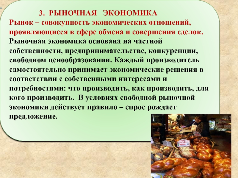 Рыночная экономика основана на частной собственности, предпринимательстве, конкуренции, свободном ценообразовании. Каждый производитель самостоятельно принимает экономические решения в соответствии с собственными интересами и потребностями: что производить, как производить, для кого производить. В условиях свободной рыночной экономики действует правило – спрос рождает предложение.