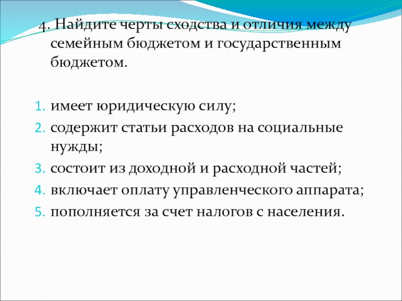 Слайд 314. Найдите черты сходства и отличия между семейным бюджетом и государственным