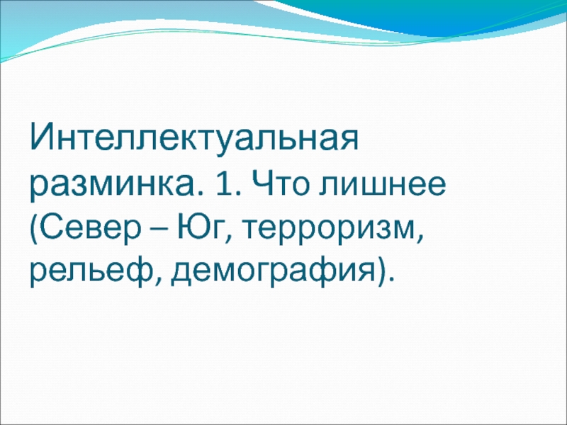 Слайд 5Интеллектуальная разминка. 1. Что лишнее (Север – Юг, терроризм, рельеф, демография).