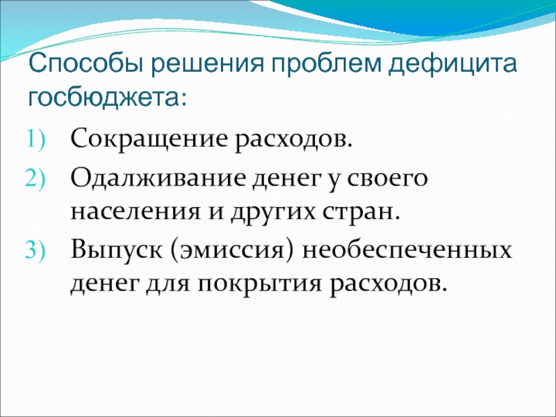 Слайд 26Способы решения проблем дефицита госбюджета: