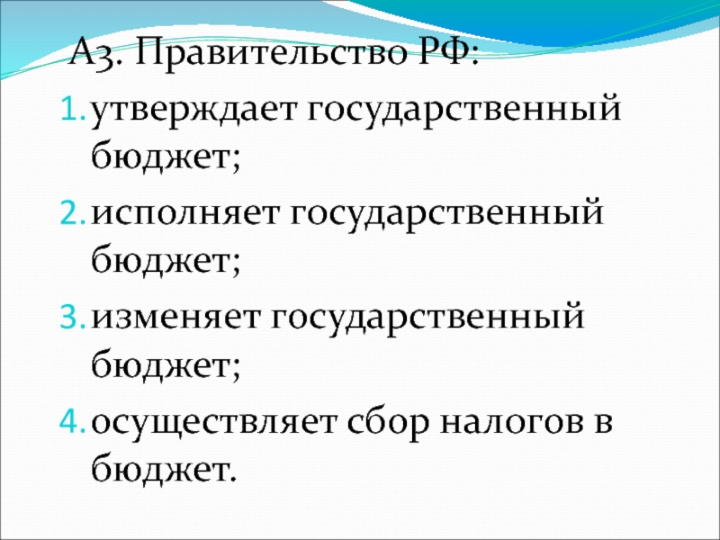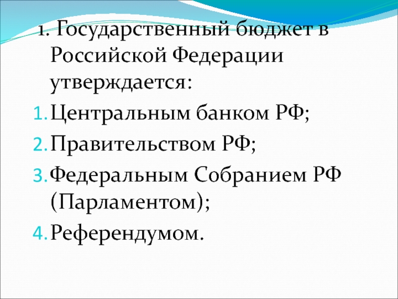 Слайд 281. Государственный бюджет в Российской Федерации утверждается: