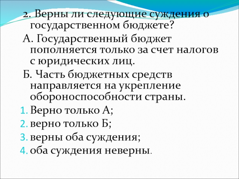 Слайд 292. Верны ли следующие суждения о государственном бюджете?