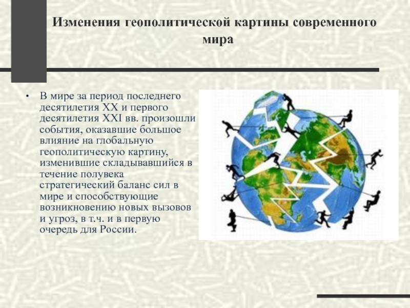 В мире за период последнего десятилетия ХХ и первого десятилетия ХХI вв. произошли события, оказавшие большое влияние на глобальную геополитическую картину, изменившие складывавшийся в течение полувека стратегический баланс сил в мире и способствующие возникновению новых вызовов и угроз, в т.ч. и в первую очередь для России.