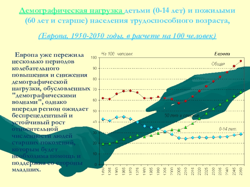 Европа уже пережила несколько периодов колебательного повышения и снижения демографической нагрузки, обусловленных "демографическими волнами", однако впереди регион ожидает беспрецедентный и устойчивый рост относительной численности людей старших поколений, которым будет необходима помощь и поддержка со стороны младших.