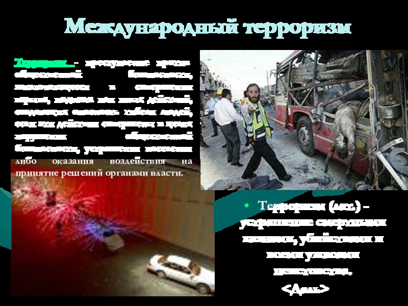 Терроризм - преступление против общественной безопасности, заключающееся в совершении взрыва, поджога или иных действий, создающих опасность гибели людей, если эти действия совершены в целях нарушения общественной безопасности, устрашения населения либо оказания воздействия на принятие решений органами власти.