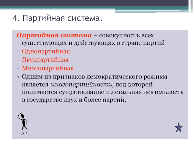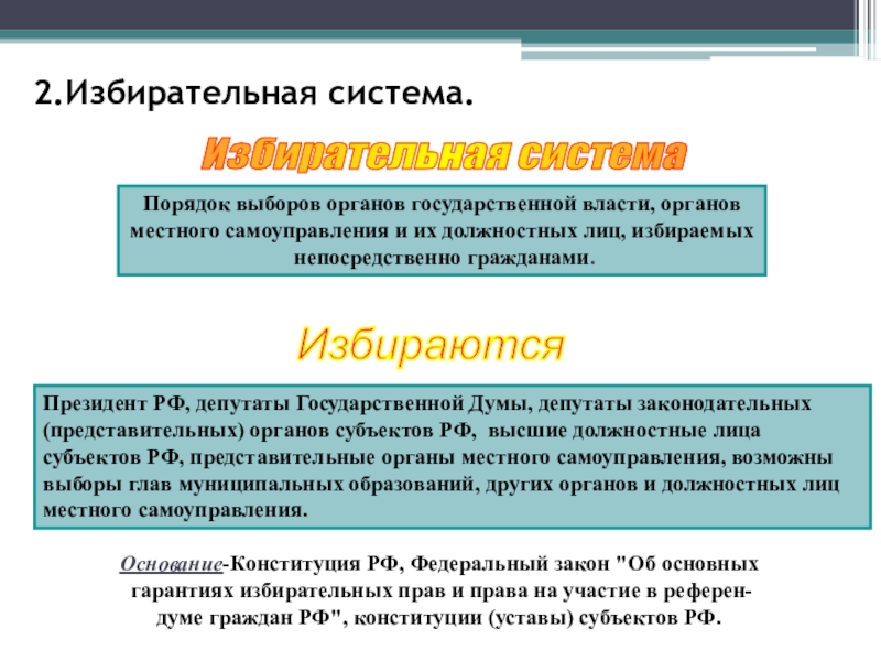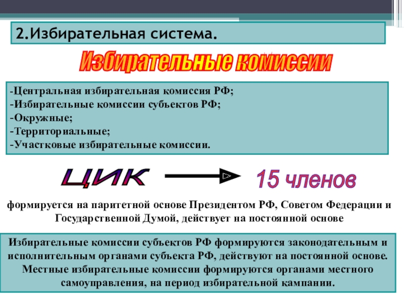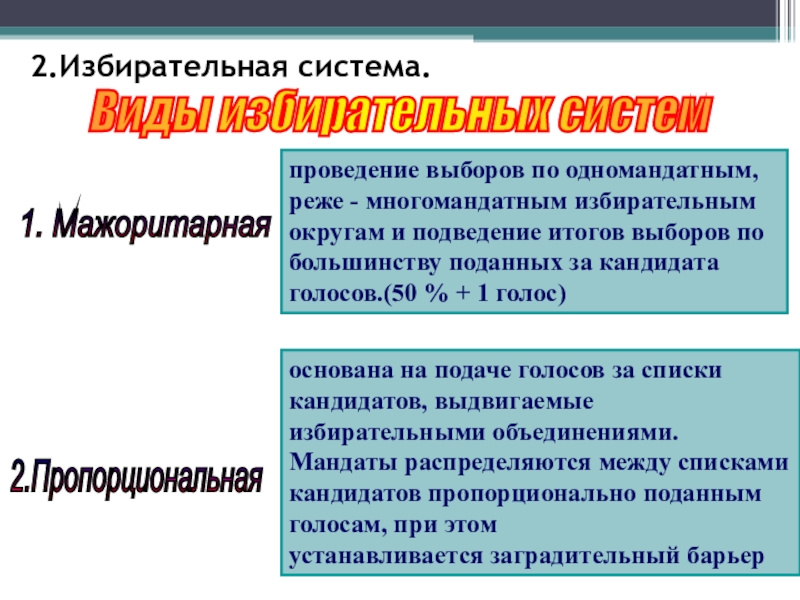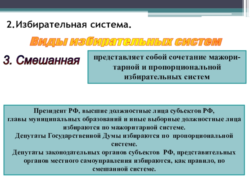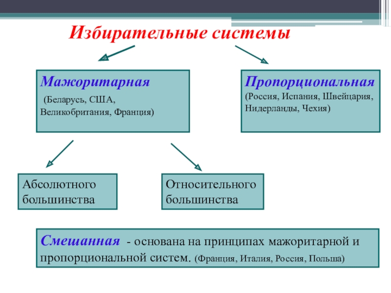 Смешанная - основана на принципах мажоритарной и пропорциональной систем. (Франция, Италия, Россия, Польша)
