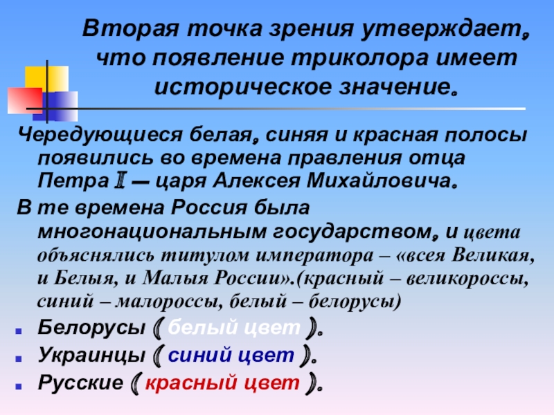 Слайд 12Вторая точка зрения утверждает, что появление триколора имеет историческое значение.
