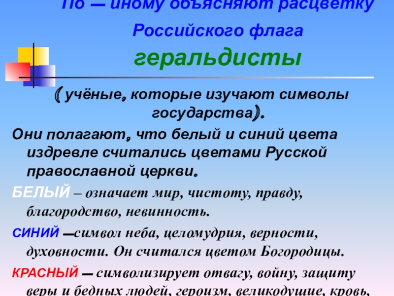 Слайд 14По – иному объясняют расцветку Российского флага геральдисты