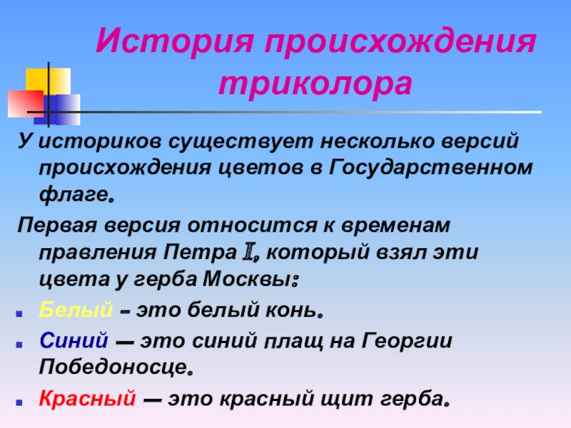 Первая версия относится к временам правления Петра I, который взял эти цвета у герба Москвы: