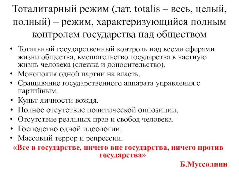 Тотальный государственный контроль над всеми сферами жизни общества, вмешательство государства в частную жизнь человека (слежка и доносительство).