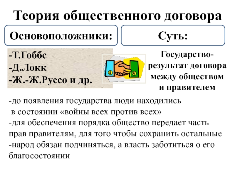 -для обеспечения порядка общество передает часть прав правителям, для того чтобы сохранить остальные