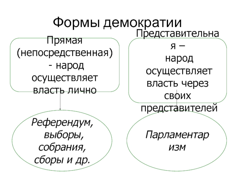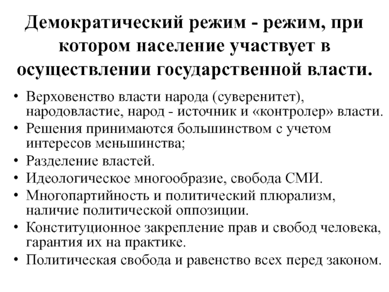 Верховенство власти народа (суверенитет), народовластие, народ - источник и «контролер» власти.