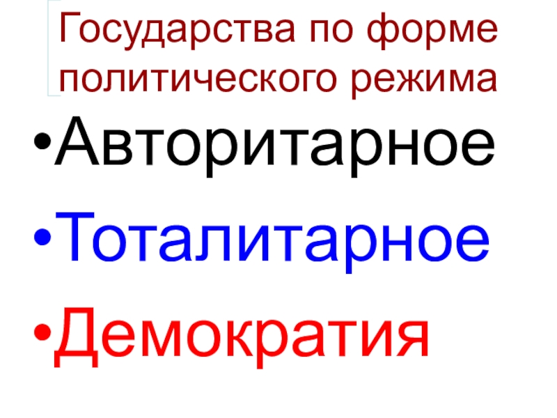 Государства по форме политического режимаАвторитарноеТоталитарноеДемократия