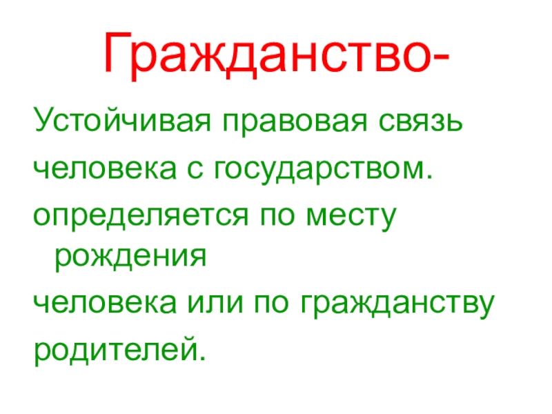 Гражданство-Устойчивая правовая связь человека с государством.определяется по месту рождениячеловека или по гражданствуродителей.
