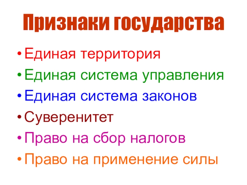 Признаки государстваЕдиная территорияЕдиная система управленияЕдиная система законовСуверенитетПраво на сбор налоговПраво на применение силы