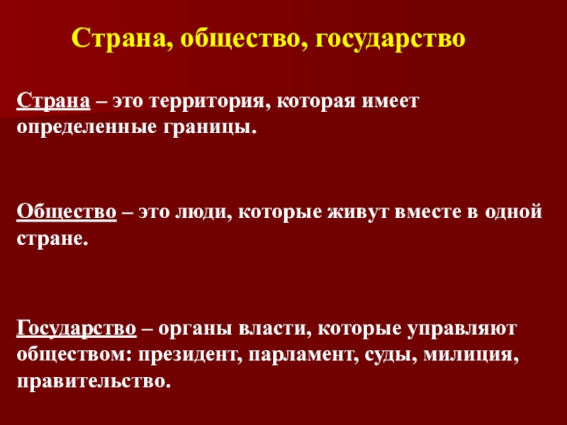 Государство – органы власти, которые управляют обществом: президент, парламент, суды, милиция, правительство.