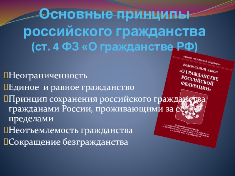 Слайд 5Основные принципы российского гражданства (ст. 4 ФЗ «О гражданстве РФ)