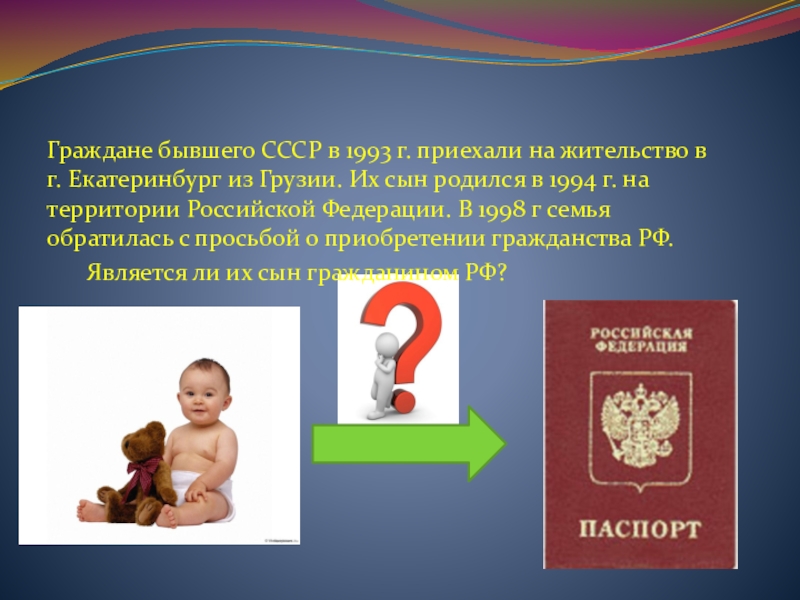 Граждане бывшего СССР в 1993 г. приехали на жительство в г. Екатеринбург из Грузии. Их сын родился