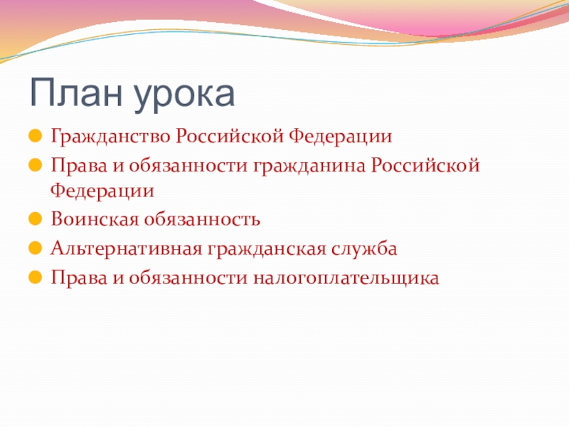 План урокаГражданство Российской ФедерацииПрава и обязанности гражданина Российской ФедерацииВоинская обязанностьАльтернативная гражданская службаПрава и обязанности налогоплательщика