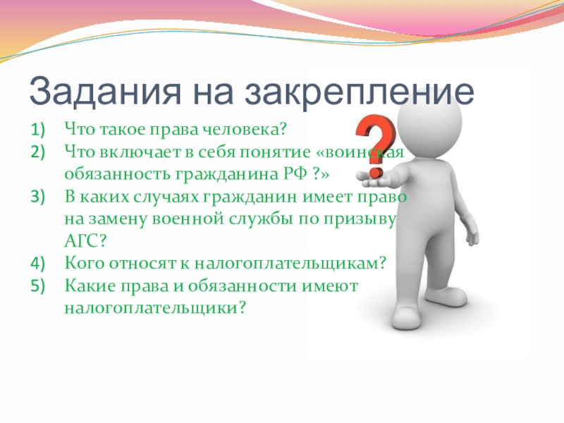 Задания на закреплениеЧто такое права человека?Что включает в себя понятие «воинская обязанность гражданина РФ ?»В каких случаях