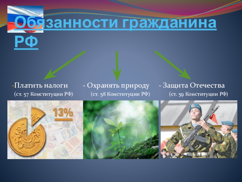 Обязанности гражданина РФПлатить налоги    - Охранять природу   - Защита Отечества(ст. 57 Конституции