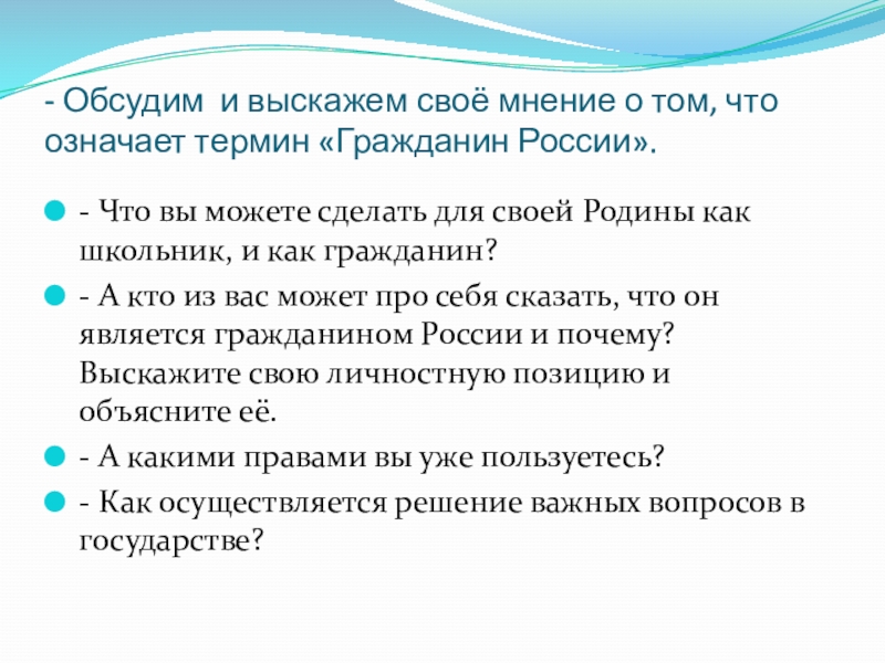 - А кто из вас может про себя сказать, что он является гражданином России и почему? Выскажите свою личностную позицию и объясните её.