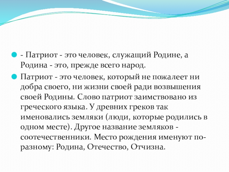 Патриот - это человек, который не пожалеет ни добра своего, ни жизни своей ради возвышения своей Родины. Слово патриот заимствовано из греческого языка. У древних греков так именовались земляки (люди, которые родились в одном месте). Другое название земляков - соотечественники. Место рождения именуют по-разному: Родина, Отечество, Отчизна.