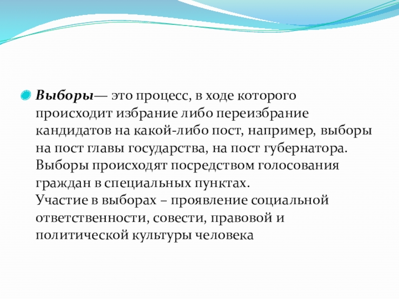 Слайд 21Выборы— это процесс, в ходе которого происходит избрание либо переизбрание кандидатов