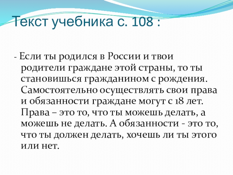твои родители граждане этой страны, то ты становишься гражданином с рождения. Самостоятельно осуществлять свои права и обязанности граждане могут с 18 лет. Права – это то, что ты можешь делать, а можешь не делать. А обязанности - это то, что ты должен делать, хочешь ли ты этого или нет.