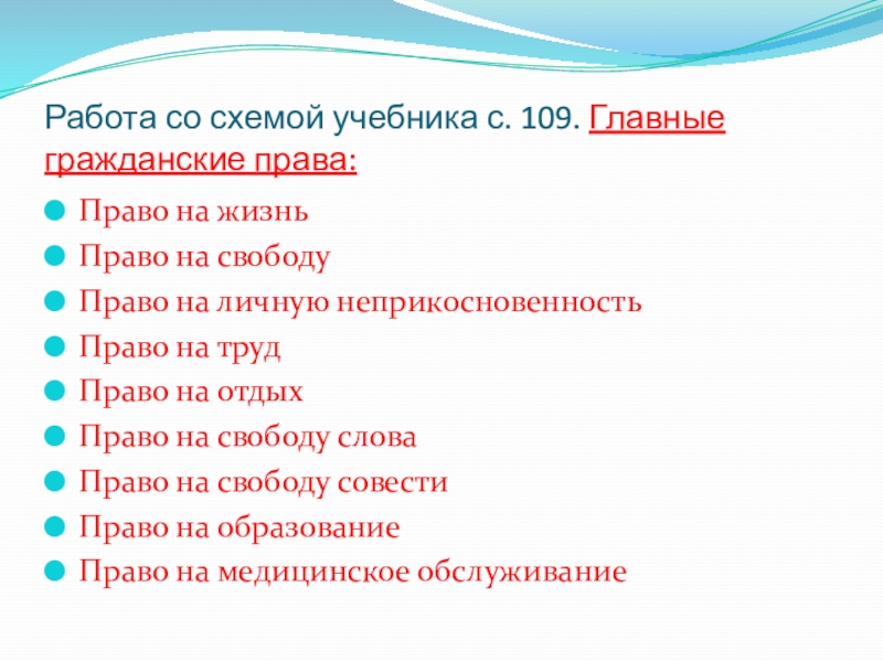Слайд 28Работа со схемой учебника с. 109. Главные гражданские права: