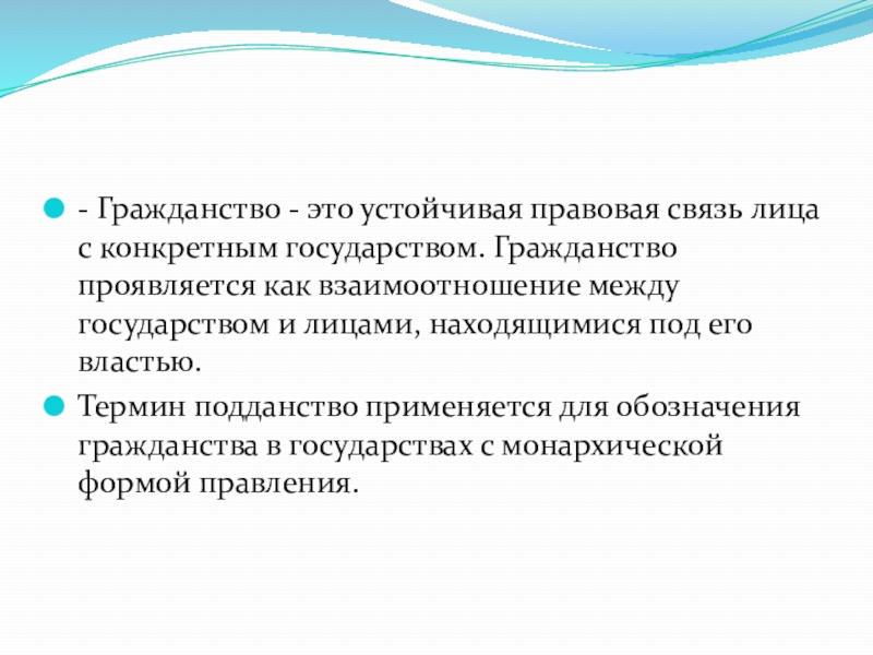 Гражданство проявляется как взаимоотношение между государством и лицами, находящимися под его властью.