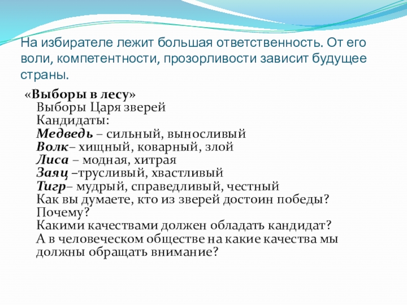 Слайд 24На избирателе лежит большая ответственность. От его воли, компетентности, прозорливости зависит