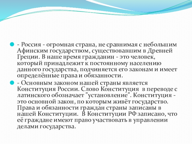 - Основным законом нашей страны является Конституция России. Слово Конституция в переводе с латинского обозначает "установление". Конституция - это основной закон, по которым живёт государство. Права и обязанности граждан страны записаны в нашей Конституции. В Конституции РФ записано, что её граждане имеют право участвовать в управлении делами государства.