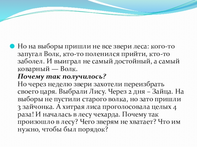 Но через неделю звери захотели переизбрать своего царя. Выбрали Лису. Через 2 дня – Зайца. На выборы не пустили старого волка, но зато пришли 3 зайчонка. А хитрая лиса проголосовала целых 4 раза! И началась в лесу чехарда. Почему так произошло в лесу? Чего зверям не хватает? Что им нужно, чтобы был порядок?