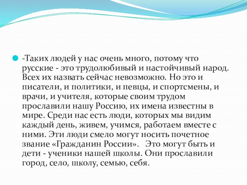 трудолюбивый и настойчивый народ. Всех их назвать сейчас невозможно. Но это и писатели, и политики, и певцы, и спортсмены, и врачи, и учителя, которые своим трудом прославили нашу Россию, их имена известны в мире. Среди нас есть люди, которых мы видим каждый день, живем, учимся, работаем вместе с ними. Эти люди смело могут носить почетное звание «Гражданин России». Это могут быть и дети - ученики нашей школы. Они прославили город, село, школу, семью, себя.