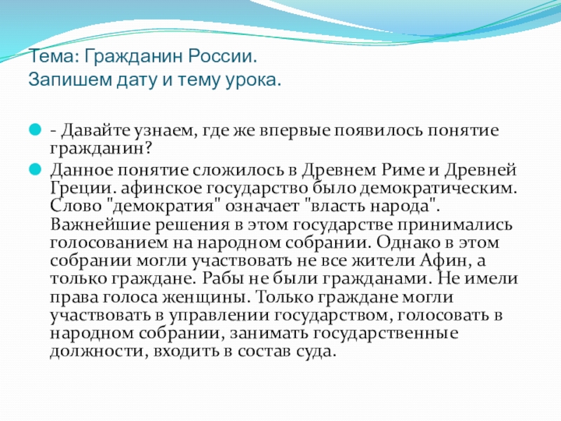 Данное понятие сложилось в Древнем Риме и Древней Греции. афинское государство было демократическим. Слово "демократия" означает "власть народа". Важнейшие решения в этом государстве принимались голосованием на народном собрании. Однако в этом собрании могли участвовать не все жители Афин, а только граждане. Рабы не были гражданами. Не имели права голоса женщины. Только граждане могли участвовать в управлении государством, голосовать в народном собрании, занимать государственные должности, входить в состав суда.
