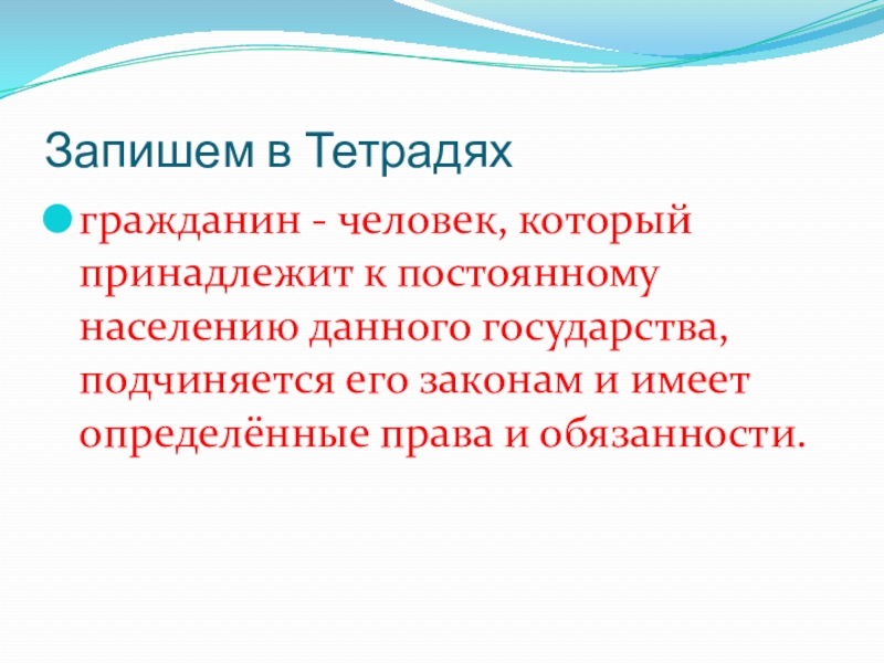 существовавшим в Древней Греции. В наше время гражданин - это человек, который принадлежит к постоянному населению данного государства, подчиняется его законам и имеет определённые права и обязанности.