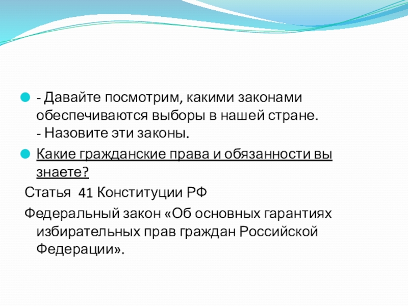 Слайд 27- Давайте посмотрим, какими законами обеспечиваются выборы в нашей стране.