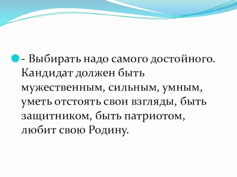 Слайд 26- Выбирать надо самого достойного. Кандидат должен быть мужественным, сильным, умным,