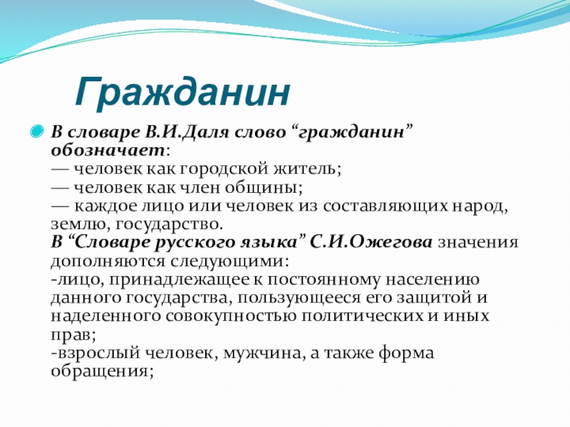 В словаре В.И.Даля слово “гражданин” обозначает: