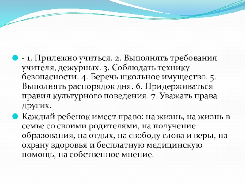 технику безопасности. 4. Беречь школьное имущество. 5. Выполнять распорядок дня. 6. Придерживаться правил культурного поведения. 7. Уважать права других.