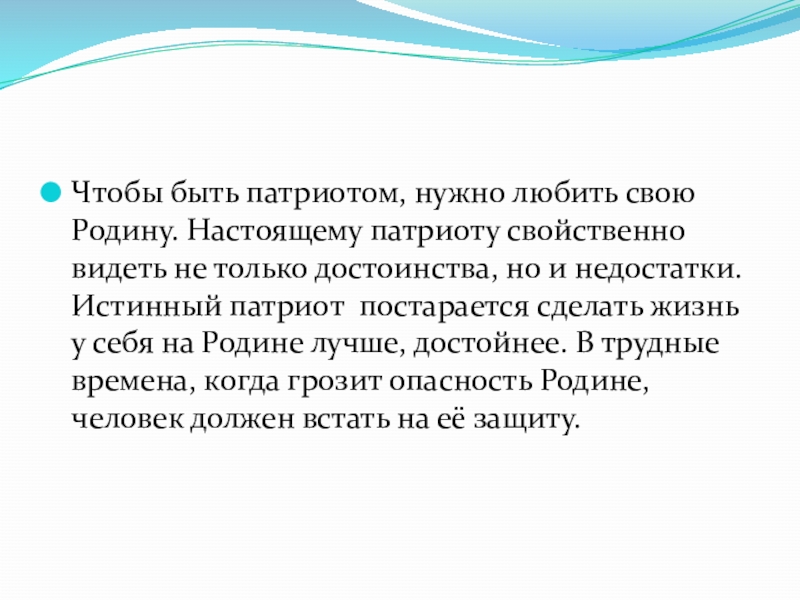 Слайд 7Чтобы быть патриотом, нужно любить свою Родину. Настоящему патриоту свойственно видеть