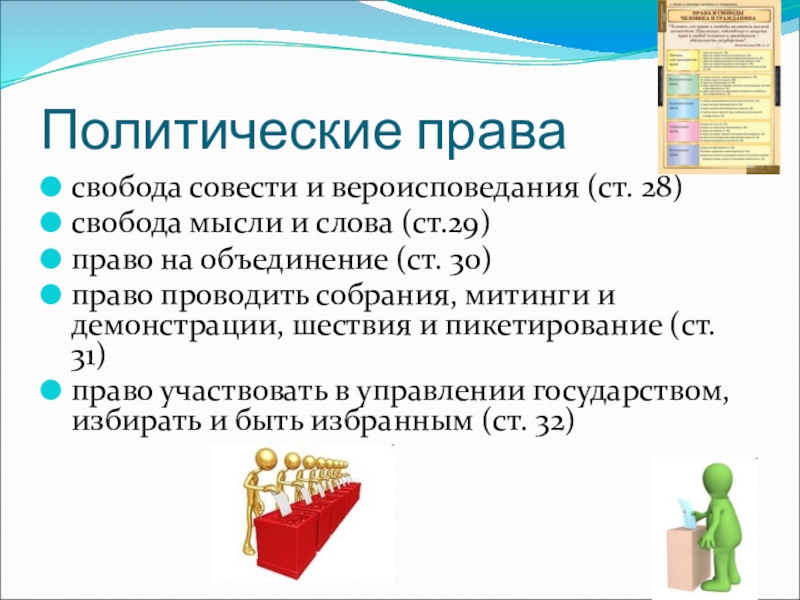 право участвовать в управлении государством, избирать и быть избранным (ст. 32)