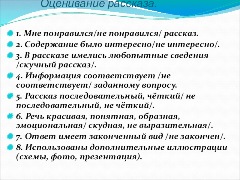 5. Рассказ последовательный, чёткий/ не последовательный, не чёткий/.