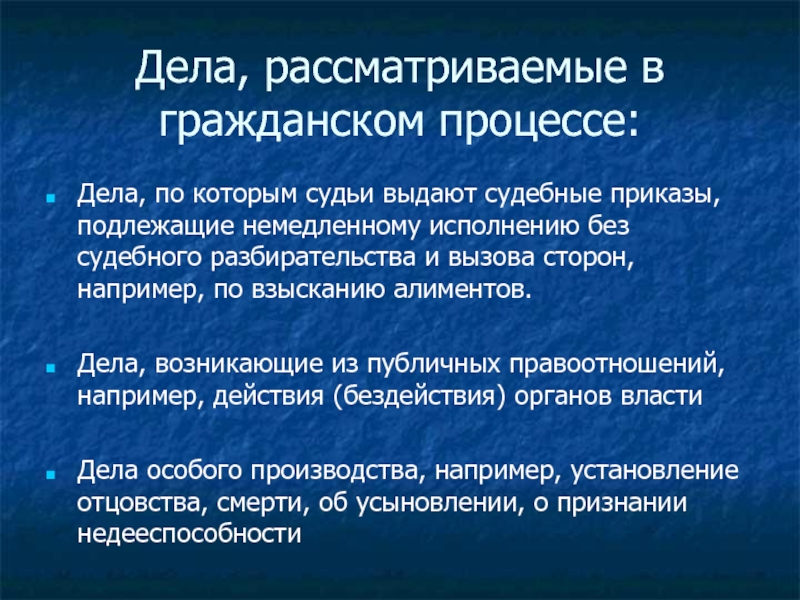 Слайд 8Дела, рассматриваемые в гражданском процессе: