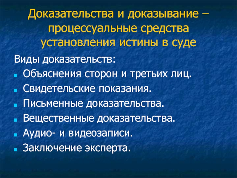 Слайд 14Доказательства и доказывание – процессуальные средства установления истины в суде